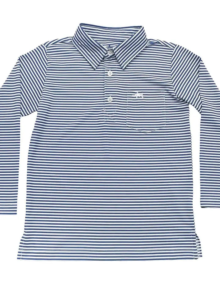 The Saltwater Boys Inshore Performance Polo in Long Sleeve Navy Stripe is the ultimate fall essential for every active little boy. Crafted from ultra-soft, moisture-wicking performance fabric, this polo keeps him cool and comfortable even on the busiest, sunniest days. Built tough for outdoor adventures yet stylish enough for church or special occasions, it combines durability with classic appeal. * Moisture-wicking fabric to keep him dry * 4-way stretch for maximum freedom of movement * Durable polyester/Lycra blend designed for active play Whether he’s exploring outside or dressing up, this long sleeve polo is a versatile addition to his wardrobe.