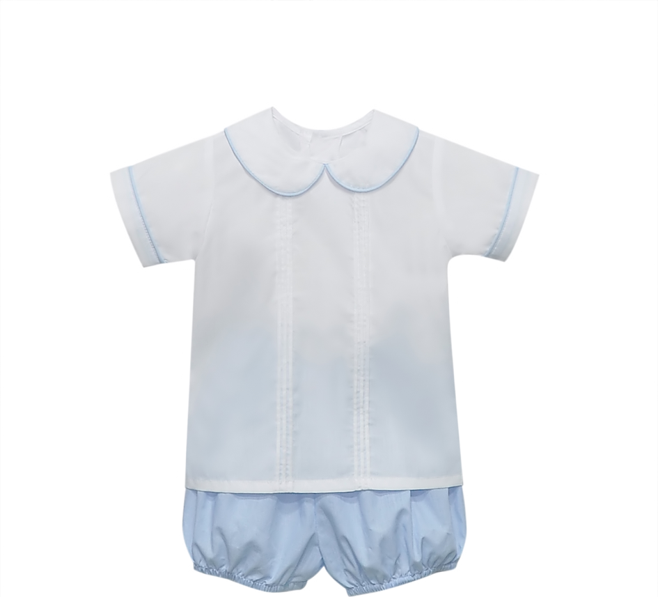 The sweetest white collared top with pleating details down the front paired with blue micro gingham shorts/bloomers. Toddler sizes have shorts; baby sizes have bloomers.