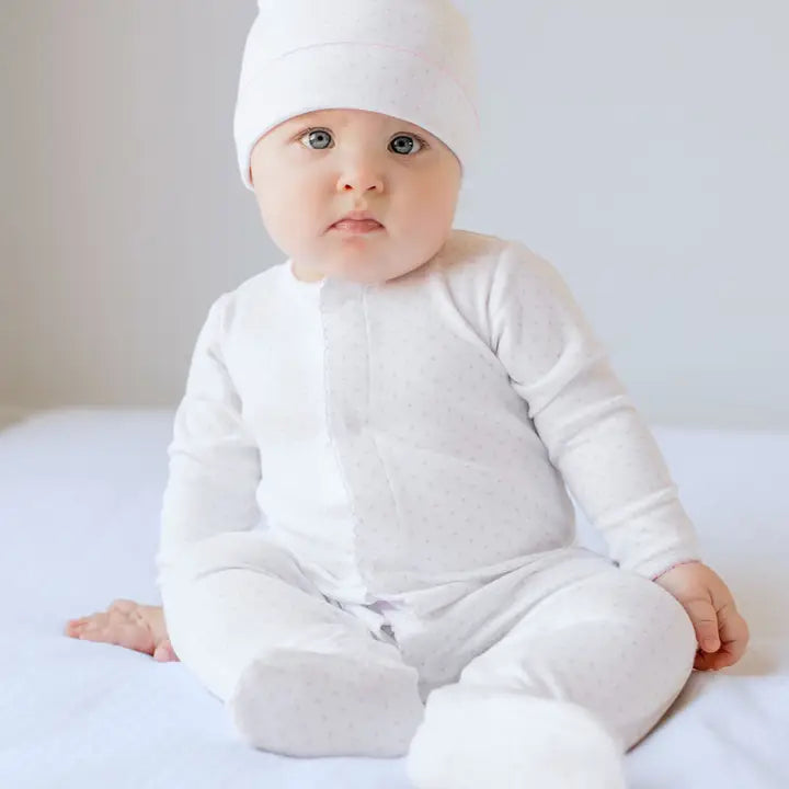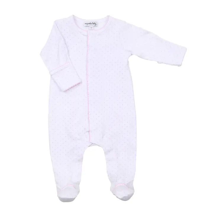 The Mini Dots Footie in Pink from Magnolia Baby is a delightful addition to your baby's wardrobe. Made from 100% Pima Cotton, it promises unmatched comfort and softness. As part of our footed bodysuit range, this piece is perfect for keeping your little one cozy and stylish. Magnolia Baby, established in 2006, is renowned for its sophisticated designs, high-grade materials, and intricate focus on wearability and quality. This footie is a testament to our commitment to style, luxury, and functional design.