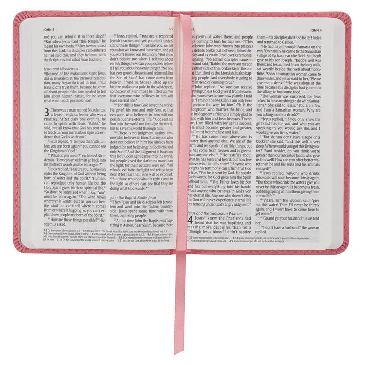 Designed especially for your little one to cherish later in life, the Faux Leather NLT New Testament Keepsake Bible is designed as a gift to commemorate birth but a gift that she can open when they are older. It is a wonderful way to introduce your kids to the timeless stories and teachings of the Bible. Heat-debossed cover design, faux leather cover, Heat-debossed title, Presentation page, Pages for birth, baptism or christening and family tree information, Special prayer for mom and dad, New Living Translation, New Testament and Psalms, Flexcover, Pink ribbon marker, Lay-flat binding, 472 pages, 7.54-point text, Size: 6.3” x 4.2” x .6”