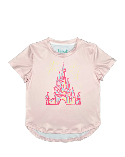 Performance material tee for girls; blue in color with bright pink lettering "Summer Vibes" on the front. High low style and runs a bit over sized!